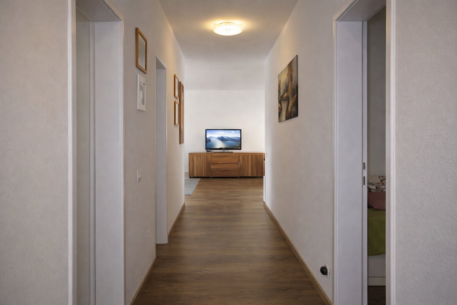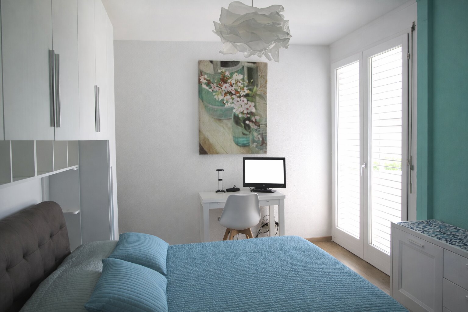 Ampio ingresso, che porta a una spaziosa area giorno tramite un corridoio. Salotto e sala da pranzo, cucina separata, una camera matrimoniale con bagno privato con doccia, un'ulteriore camera e un'ulteriore bagno con vasca. Completano gli spazi due balconi, per una superficie totale di 24 mq, accessibili da soggiorno, cucina e camera padronale.