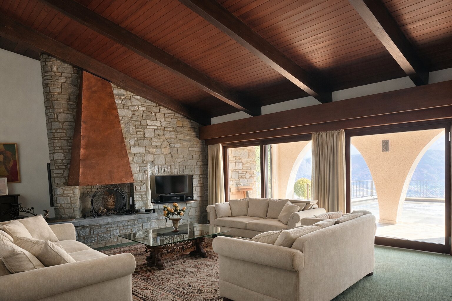 Piano terra (a livello della strada): box auto di ca. 30 mq per due posti auto. L’atrio si apre su un’ampia zona giorno che comprende soggiorno e sala da pranzo con camino in pietra naturale, collegati con la cucina abitabile. Questo spazio ha accesso diretto alla grande terrazza con vista panoramica su lago e montagne. Sempre dall’atrio si accede a un doppio servizio e a quattro camere da letto, un grande bagno con doccia, vasca da bagno e doppio lavabo.