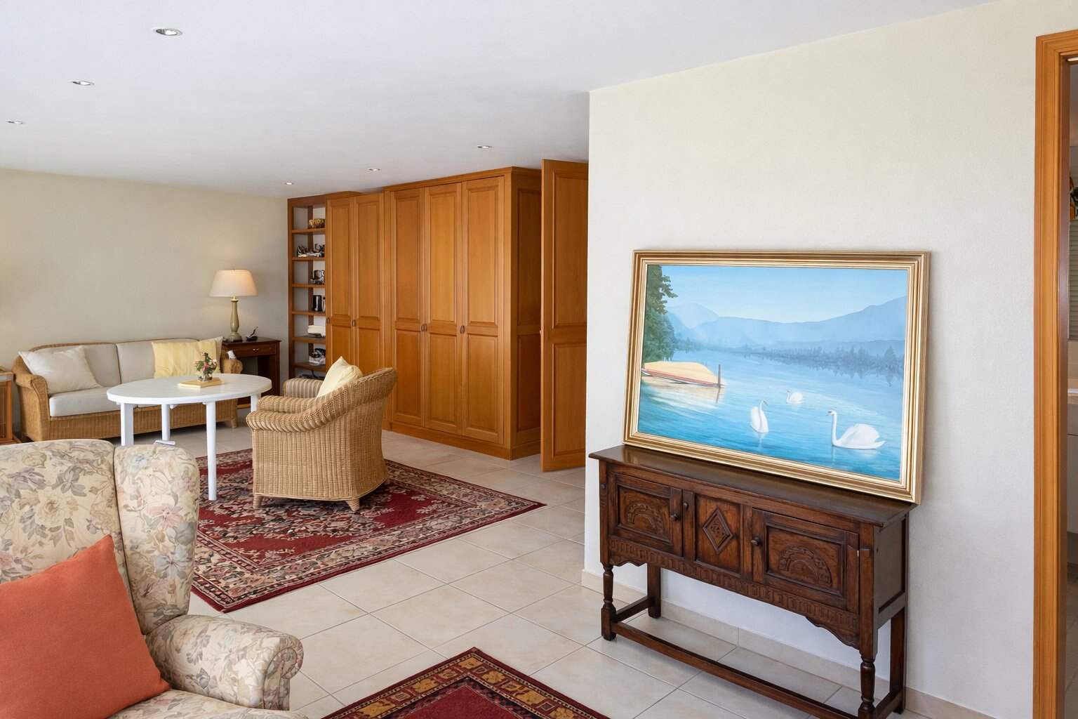 Piano inferiore (a livello del giardino): Si accede al piano inferiore tramite una scala interna. Questo piano ospita due camere e un grottino, entrambe aperti sul giardino. Inoltre, vi sono cantina, un locale riscaldamento, lavanderia con stenditoio.