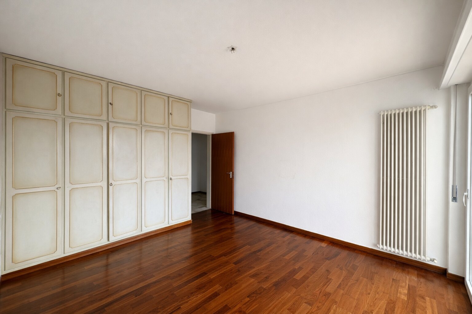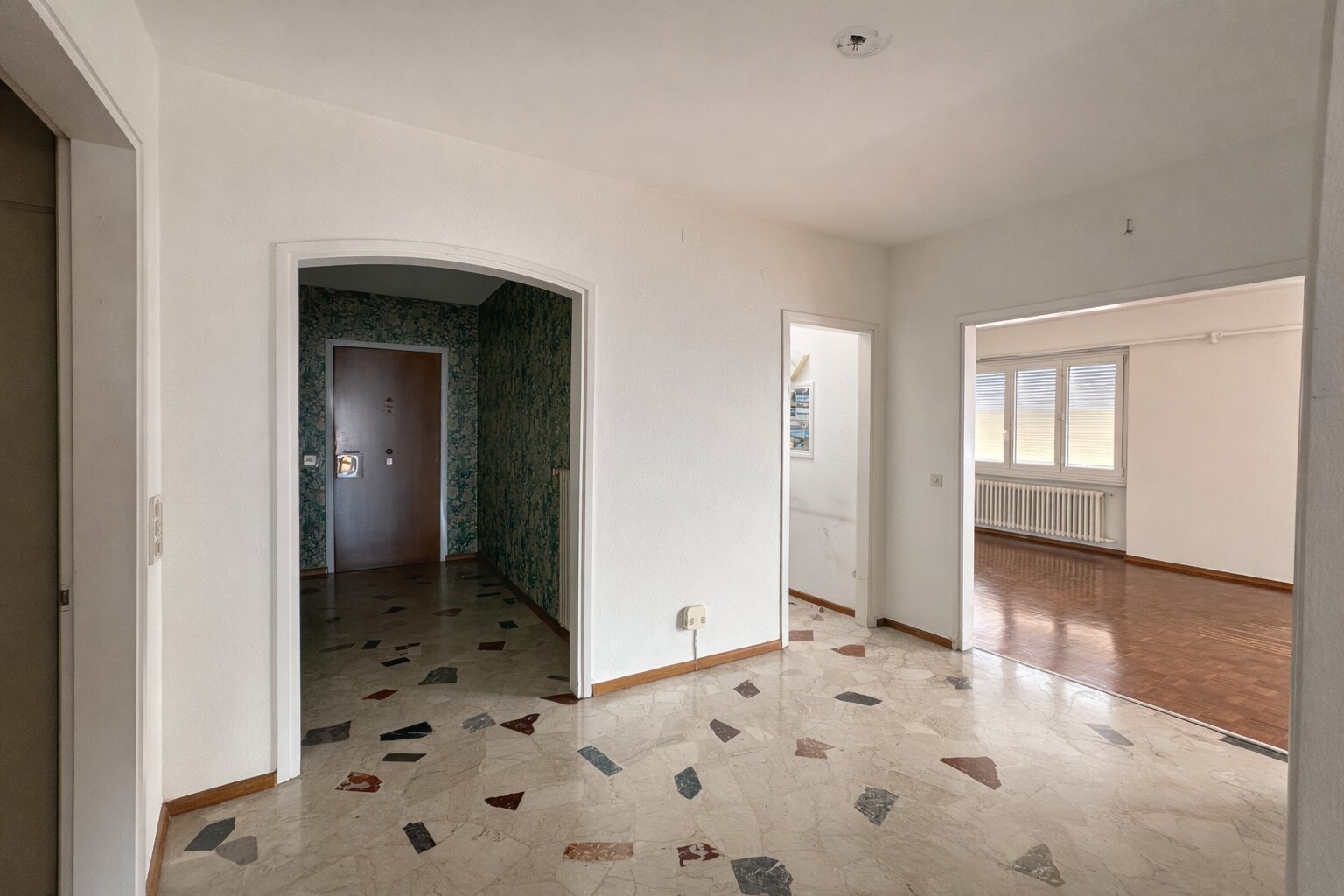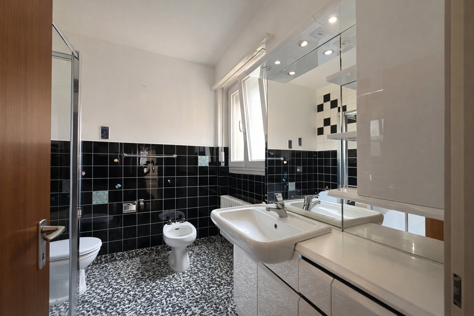 L’appartamento, di ca. 159 mq, che si presenta in discreto stato di manutenzione, si compone di un doppio atrio d’entrata, di un antibagno con armadi a muro e di un servizio ospiti. La generosa zona giorno, con grandi finestre, comprende il soggiorno e la zona pranzo di complessivi 40 mq ca. ed un locale cucina abitabile separato.