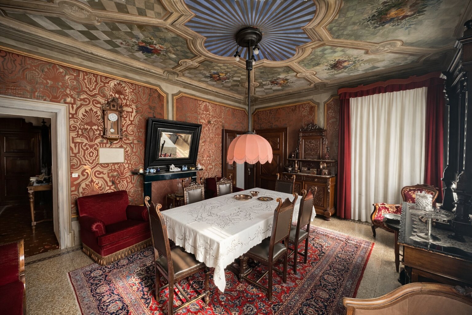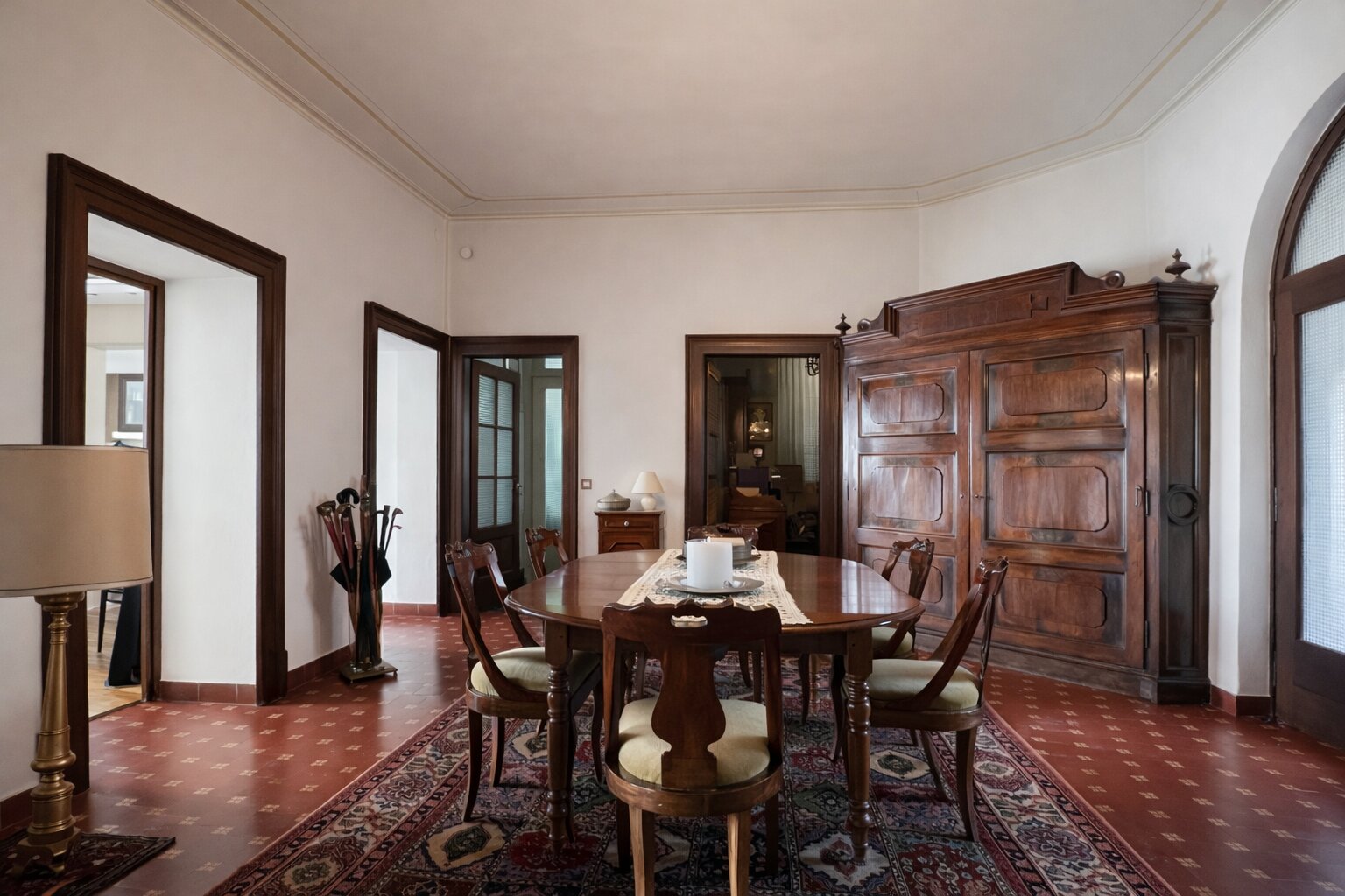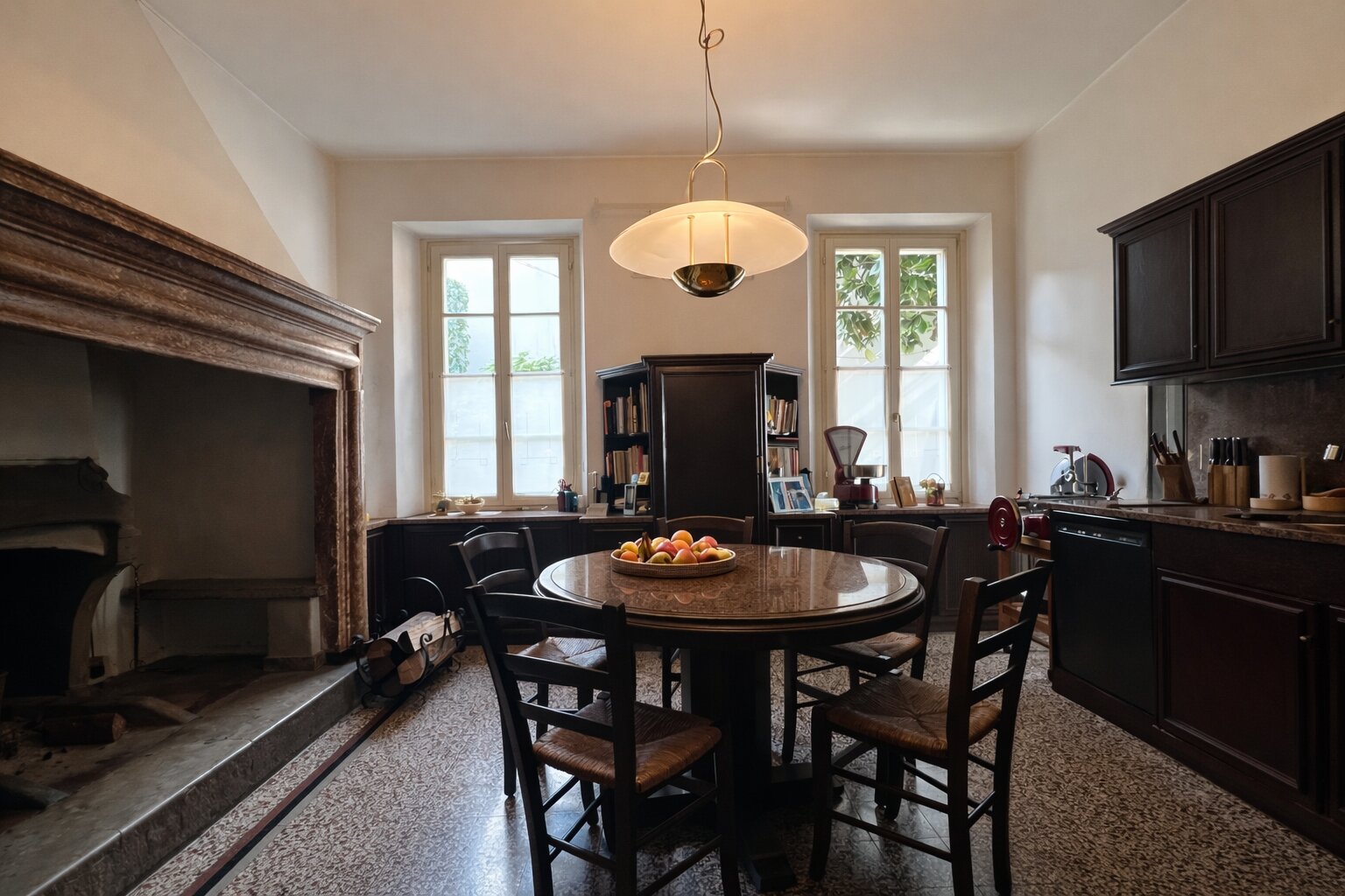 Primo piano: attraversoun’elegantissima scala d’epoca si accede ai piani superiori, dove si sviluppanoambienti abitativi di notevole respiro. Il piano si apre su un localedisponibile che conduce a un ampio salotto, collegato a un salottino piùraccolto, a una sala da pranzo con soffitto affrescato, a una cucina abitabilecon grande ed elegante camino impreziosito dal marmo di Arzo, a uno studio e aun bagno con doccia.