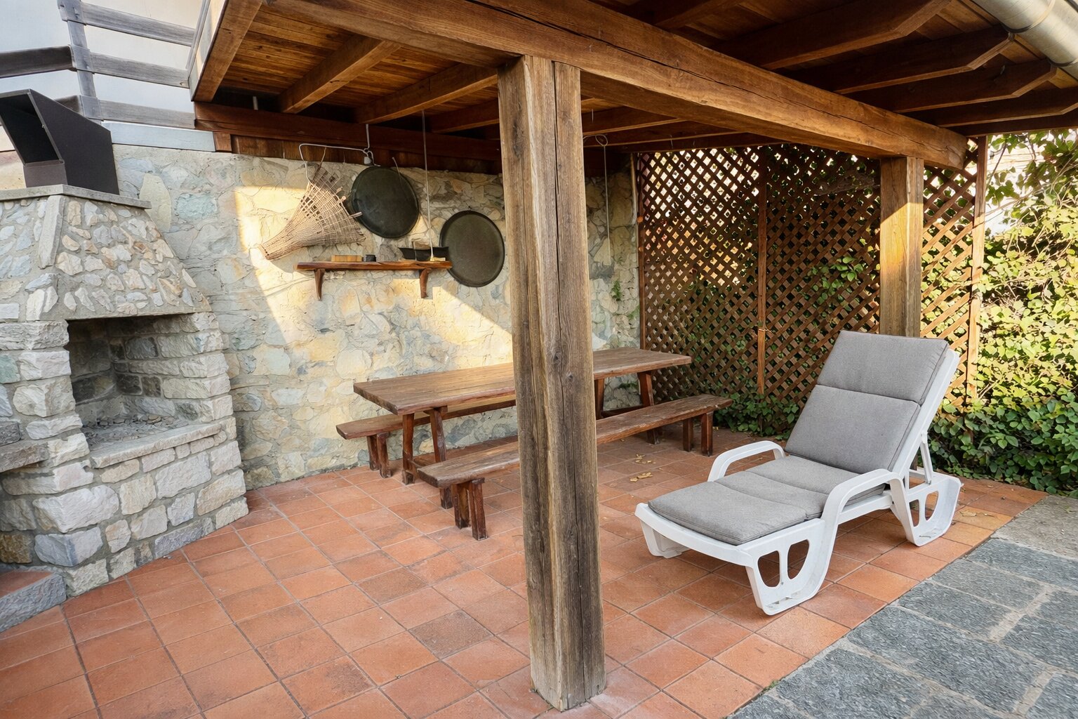 Piano Cantina: cantina contro roccia e terrazza coperta con camino.